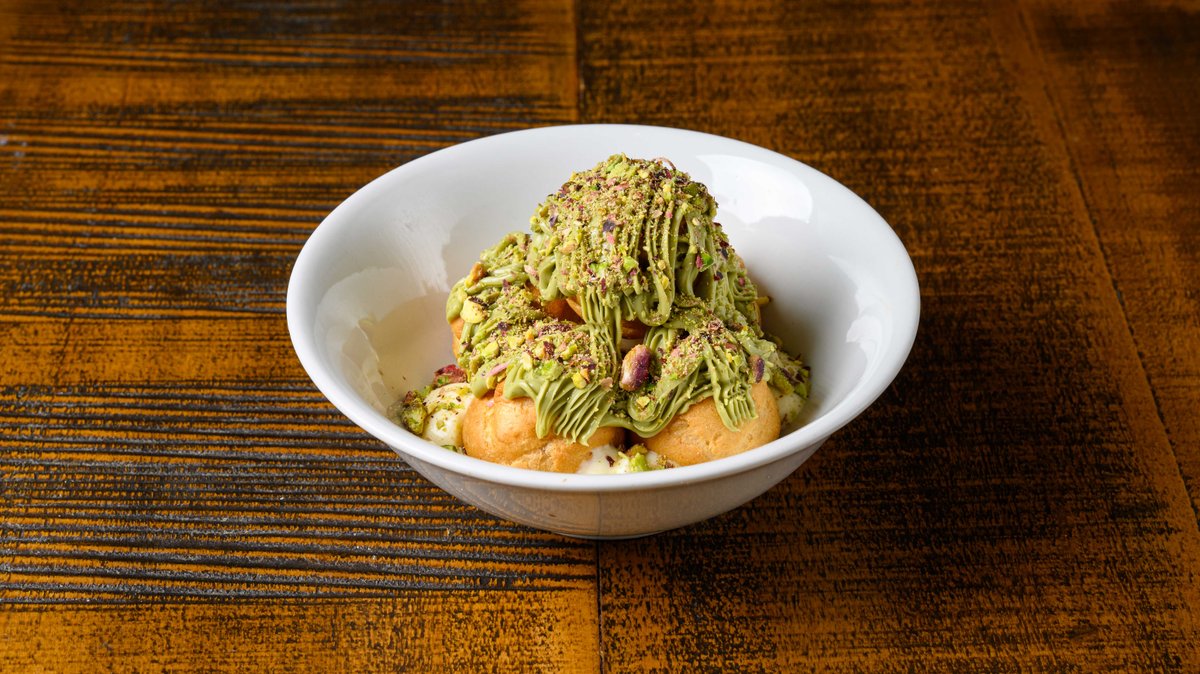 Τραγανά σου με κρέμα πατισερί αρωματισμένη με βανίλια Μαδαγασκάρης και σάλτσα από φυστίκια Αιγίνης