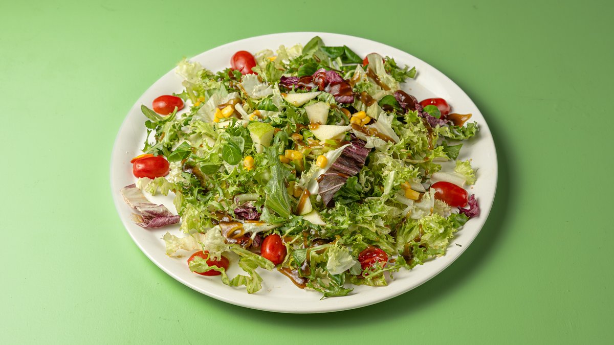 Ανάμεικτη σαλάτα με βαλεριάνα, ρόκα, καλαμπόκι, πράσινο μήλο, λιαστή ντομάτα και ντρέσσινγκ βαλσάμικου με μέλι
