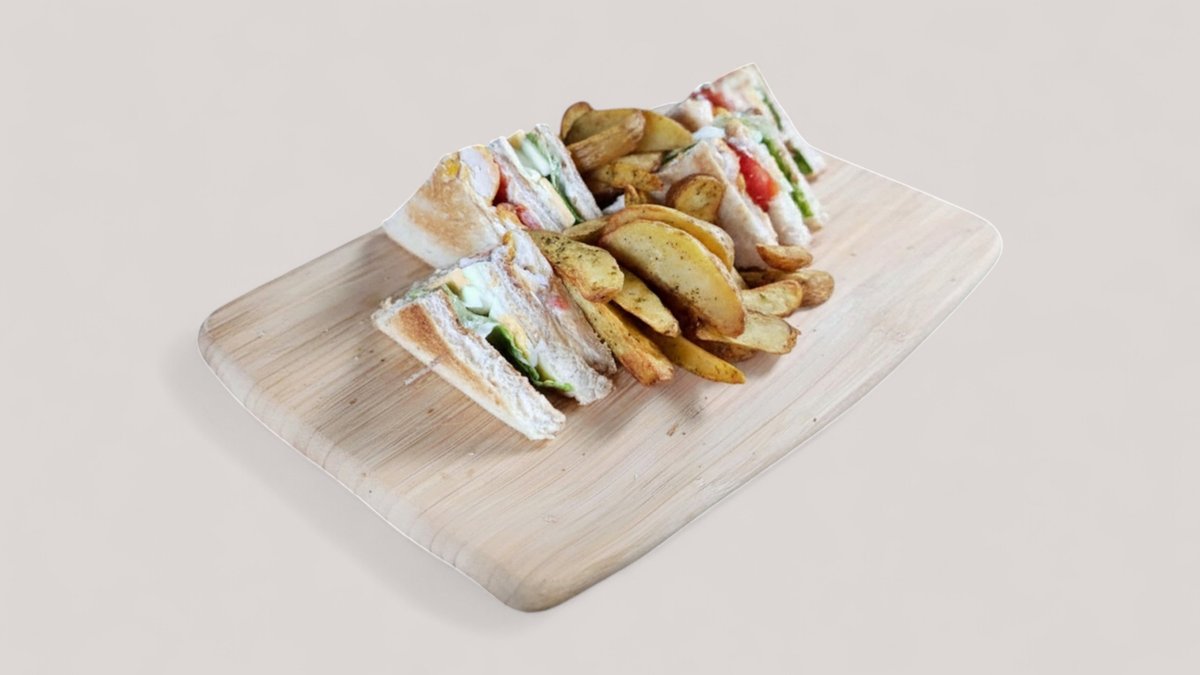 Λαχταριστο κλαμπ σάντουιτς ζαμπόν, τυρί, ντομάτα, μαρούλι, μαγιονέζα. Συνοδεύεται με πατάτες country και ντιπ μαγιονεζα.