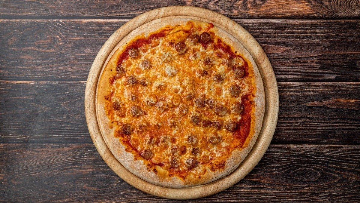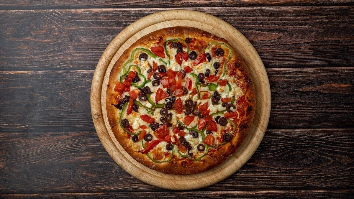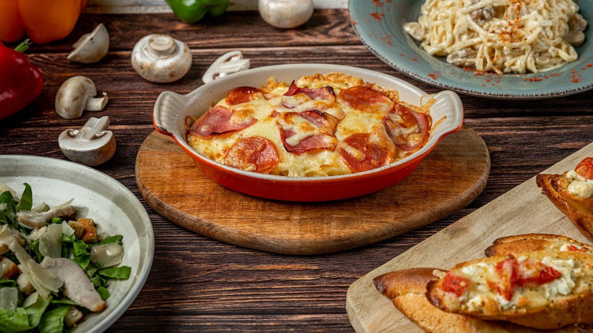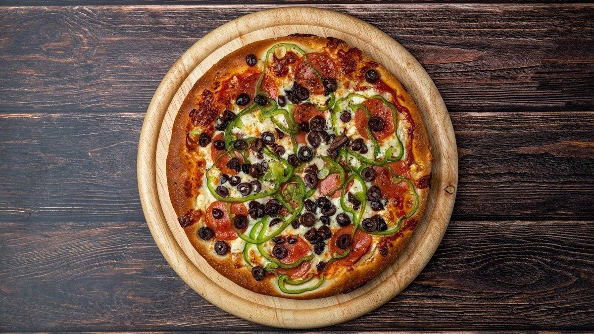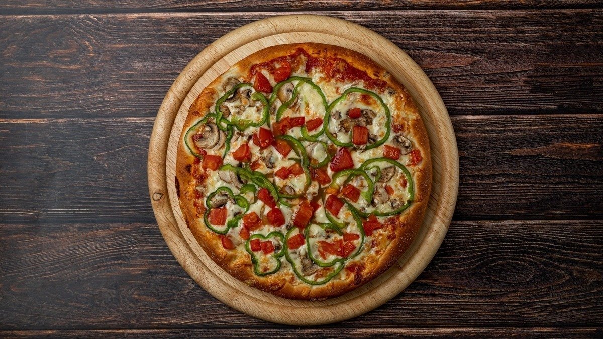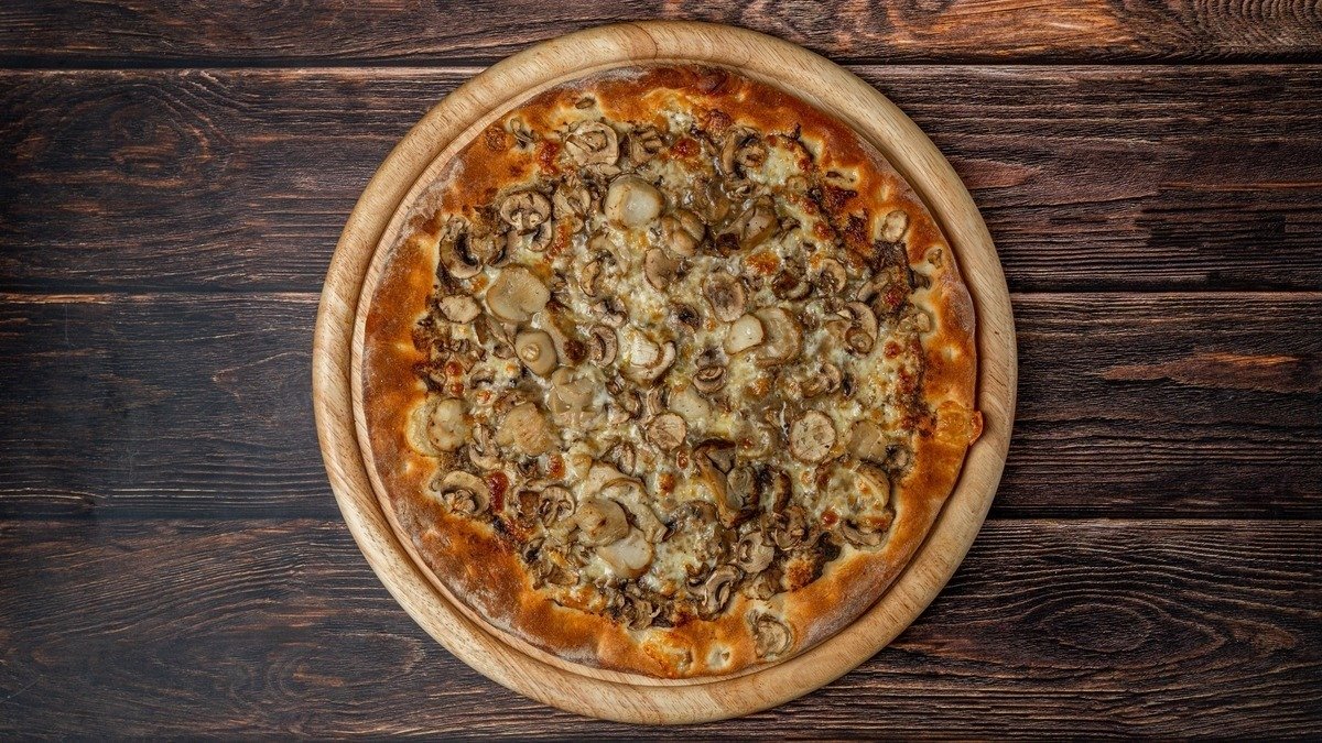 Με σάλτσα ντομάτας, mix τυριών (gouda και μοτσαρέλα), μπέικον, μανιτάρια και πιπεριά