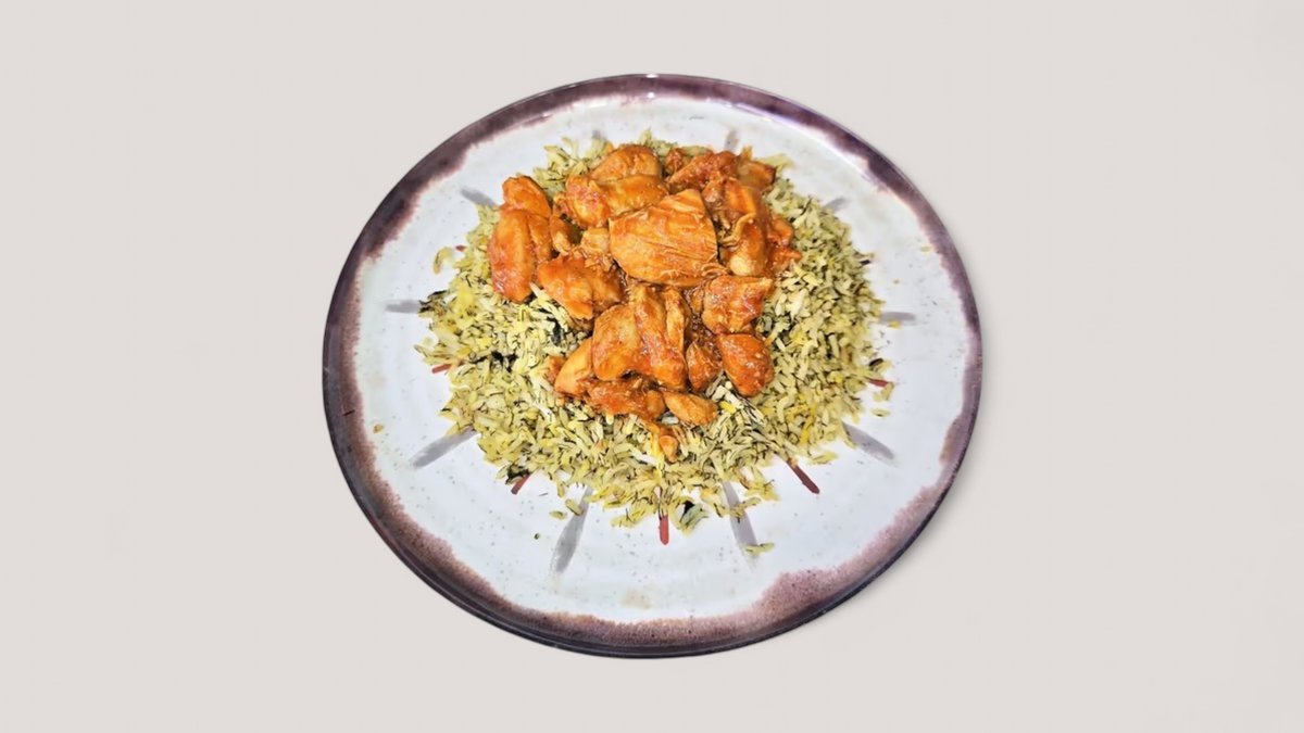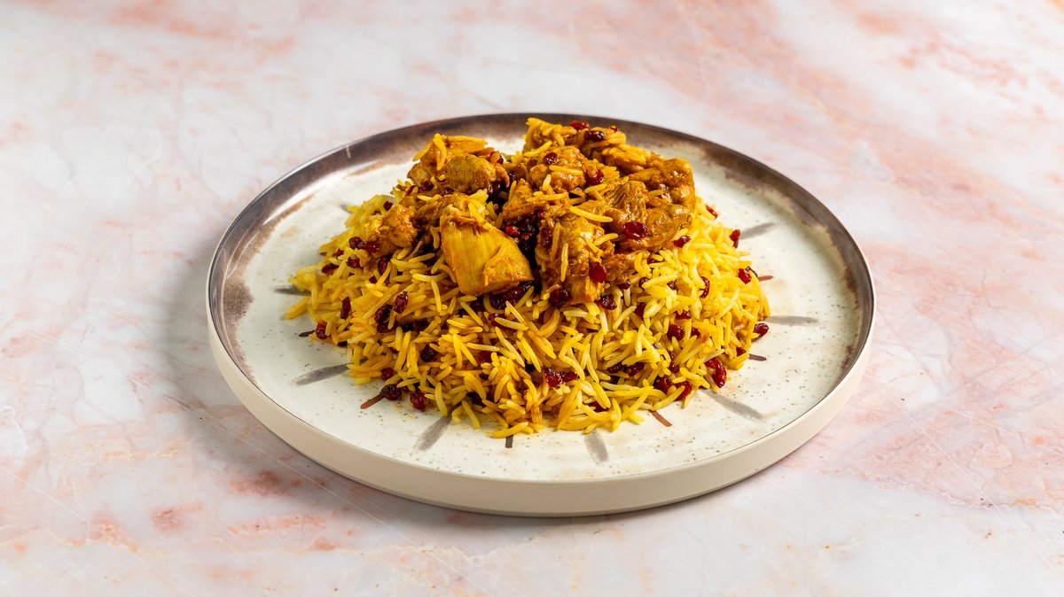 Ρύζι Basmati αναμειγμένο με σαφράν και ειδικά περσικά μούρα zereshk με κοτόπουλο και ειδικό μείγμα μπαχαρικών