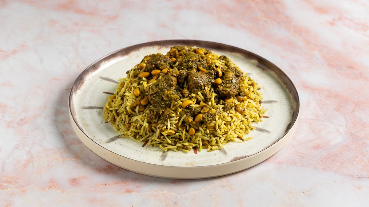 Ρύζι Basmati αναμειγμένο με κύβους μοσχαρίσιου κρέατος, μαυρομάτικα, ψιλοκομμένα βότανα και ειδικό μείγμα μπαχαρικών