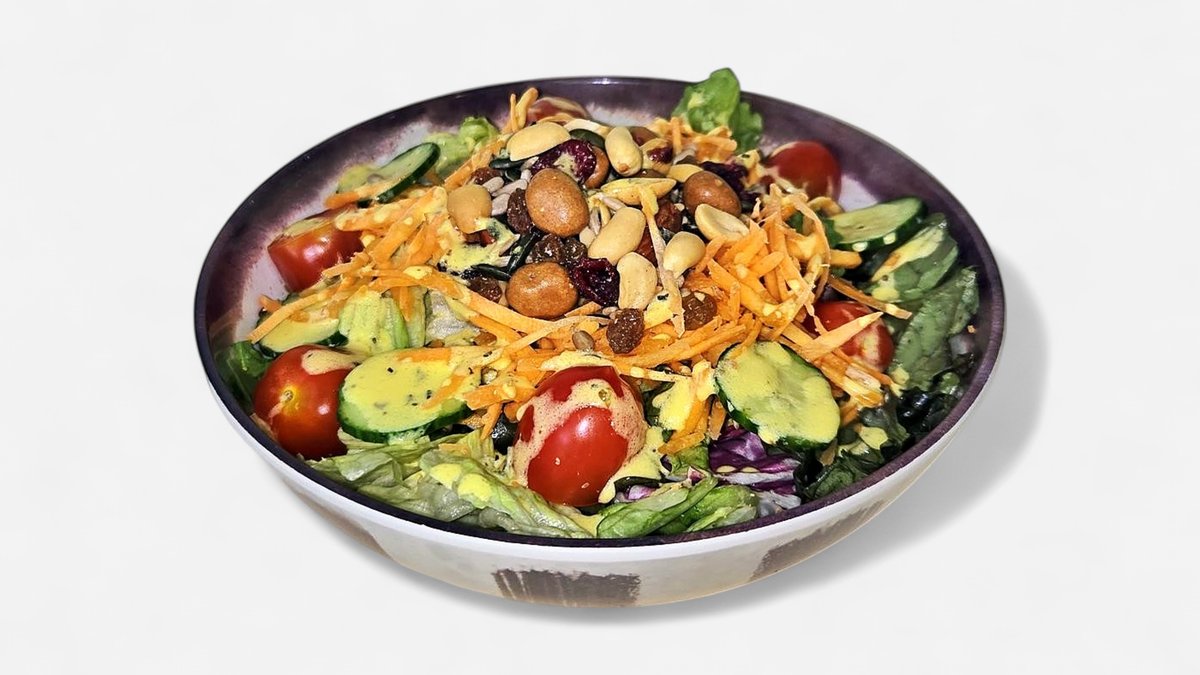 Crispy mixed lettuce, cucumbers, cherry tomatoes, carrot, and Persian mixed nuts with a Saffron Vinaigrette dressing