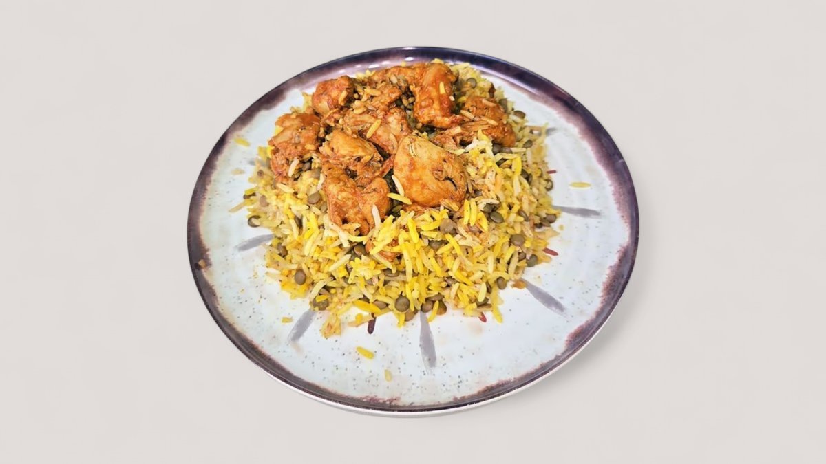 Ρύζι Basmati αναμειγμένο φακές,σαφράν, κανέλα, τραγανά κρεμμύδια, με κοτόπουλο