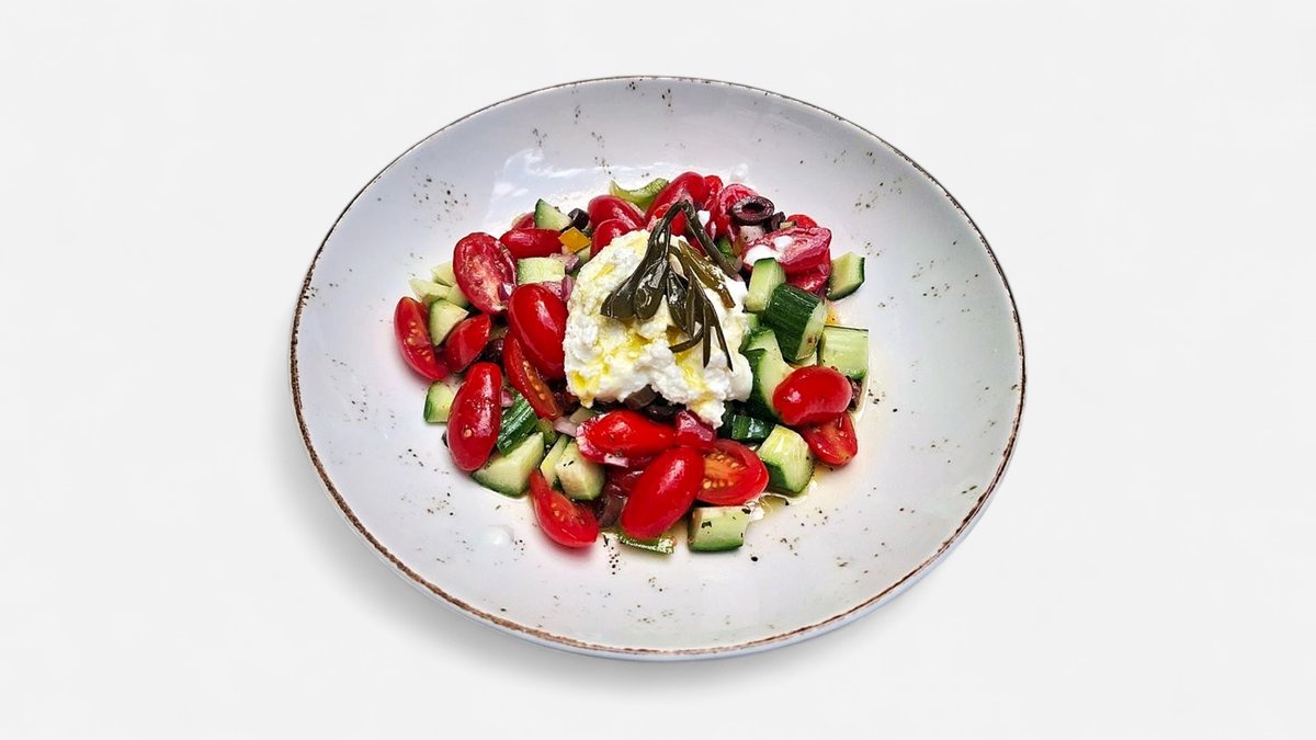 Μικροκομμένη χωριάτικη με ντοματίνια, μους φέτας, κρίταμο και παρθένο ελαιόλαδο