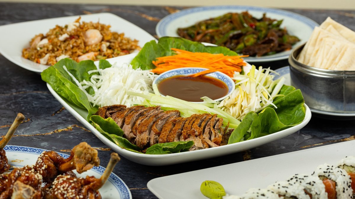 Μερίδα. Τραγανιστή πάπια. Με φρέσκα λαχανικά (αγγούρι, κρεμμύδι φρέσκο και καρότο), κρέπες Saipan και σάλτσα από δαμάσκηνα