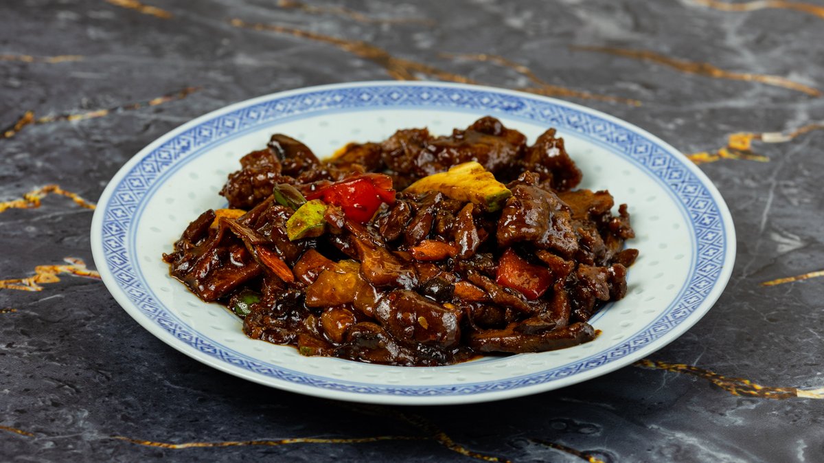 Χοντρά noodles με black bean sauce, χοιρινό και φρέσκο κρεμμύδι