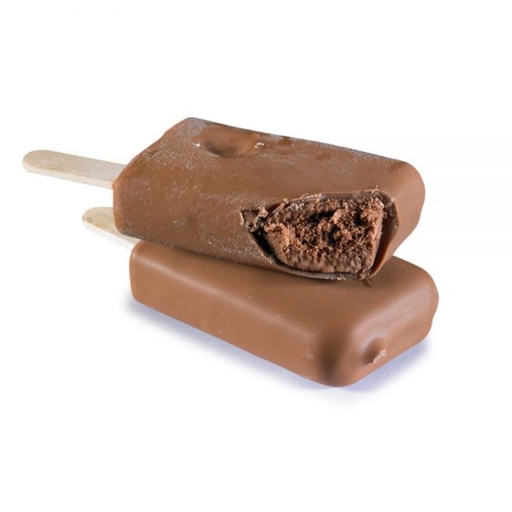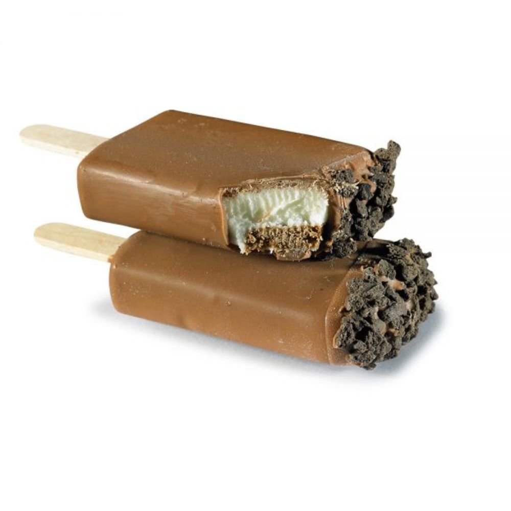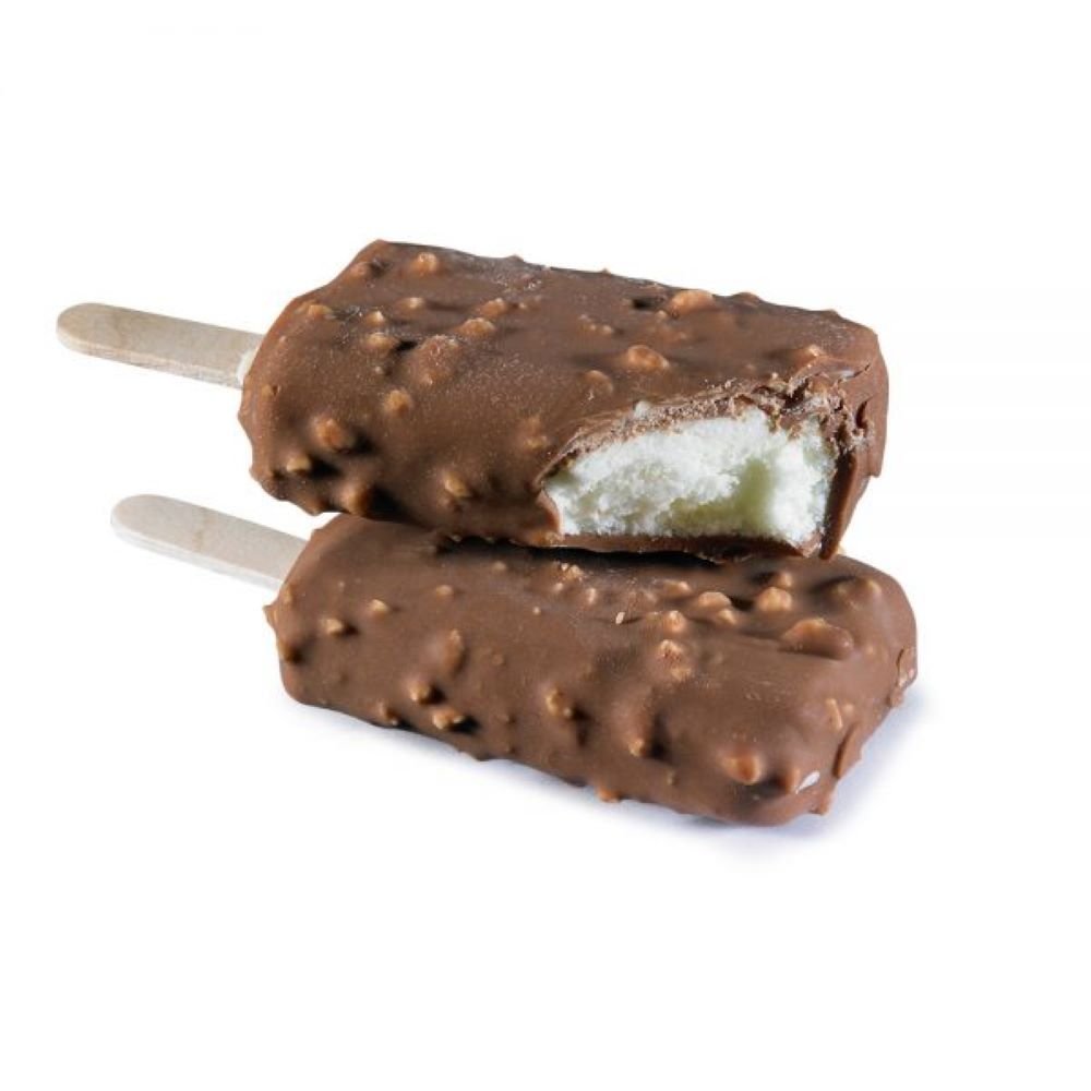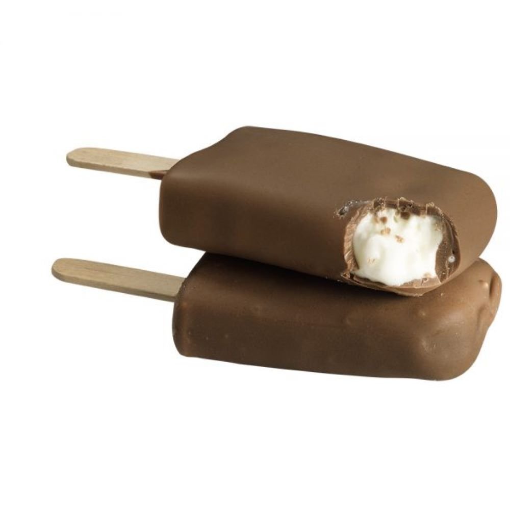 "Παγωτίνι ξυλάκι με επικάλυψη αμυγδαλάκι στην σοκολάτα γάλακτος έξω και βανίλια μέσα.