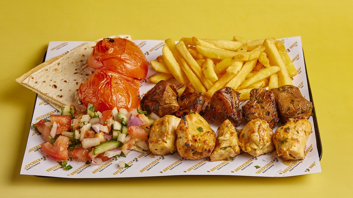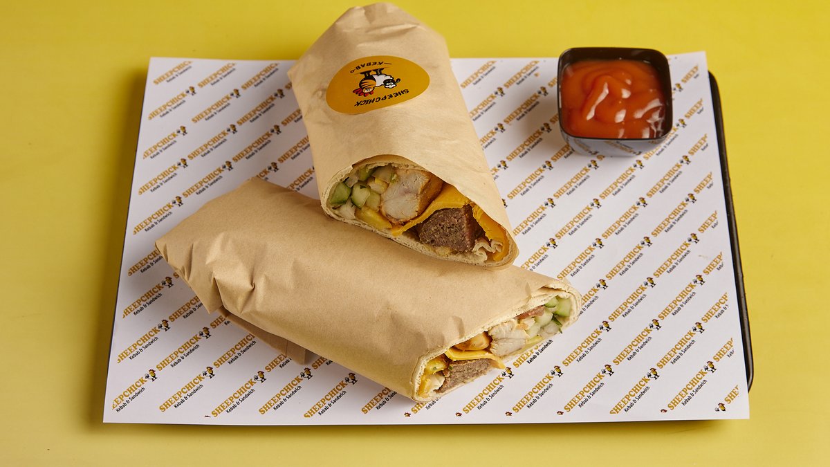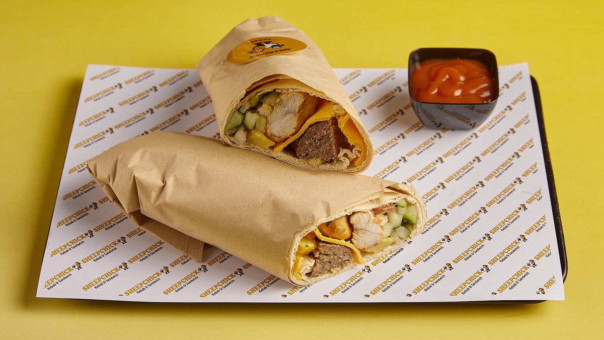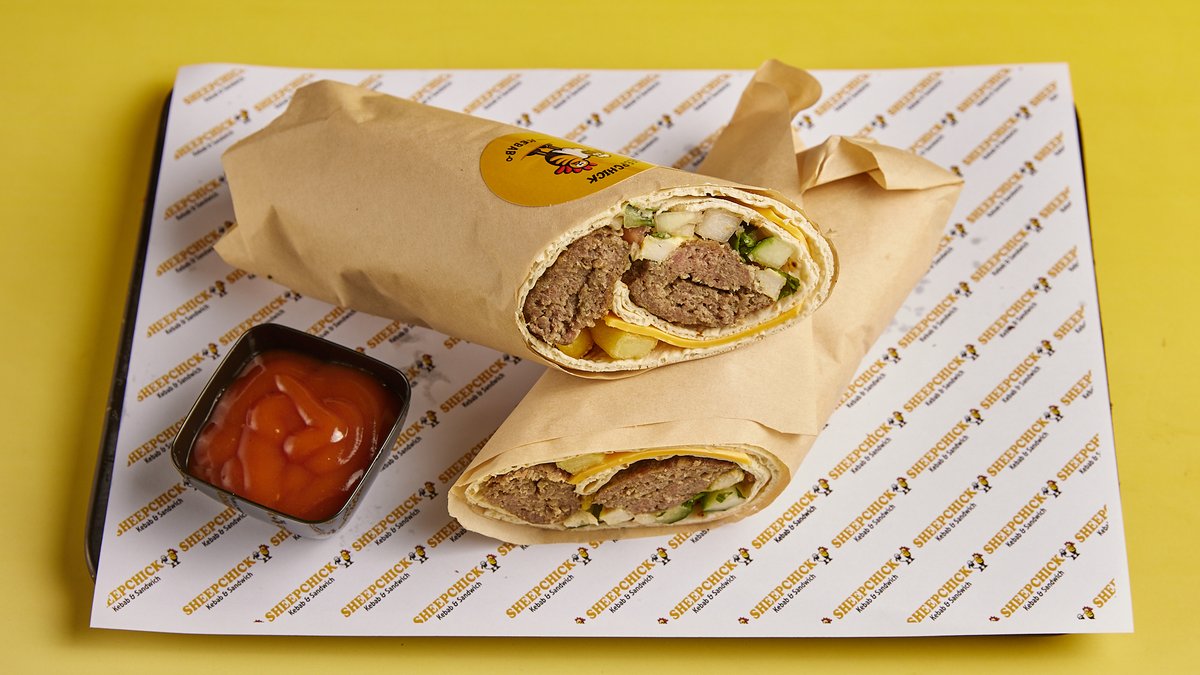 Μείγμα από 100 % αγνό χειροποίητο μοσχάρι και αρνίσιο κρέας με μερικά κομμάτια στήθος κοτόπουλου, τυρί τσένταρ, ντομάτα, αγγούρι, κρεμμύδι, μαϊντανό, πατάτες τηγανητές, sheepchick σως και σπέσιαλ πίτα