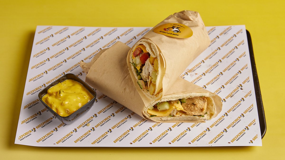 Φρέσκο φιλέτο κοτόπουλο με τη μυστική συνταγή μας, τυρί τσένταρ, κρεμμύδι, μαϊντανός, πίκλες, Sheepchick σως, πατάτες τηγανητές και σπεσιαλ πίτα