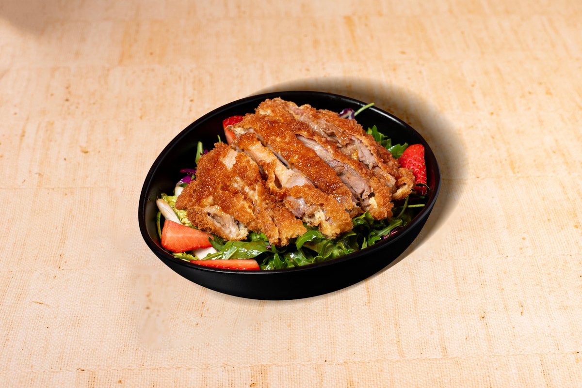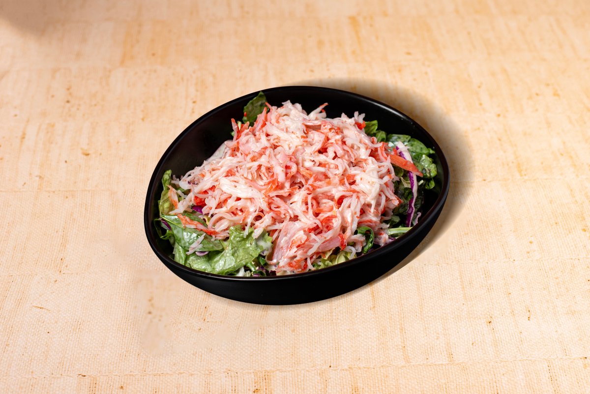 Ψίχα από ελληνικό μπλέ καβούρι*, σαλάτα με σπανάκι, λάχανο κινέζικο, ρόκα, λάχανο κόκκινο, λόλα πράσινη, σχοινόπρασο και yuzu dressing