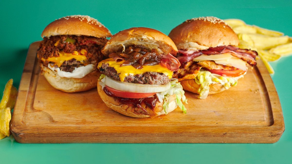 Με μπιφτέκι από μοσχαρίσιο κιμά, cheddar, καραμελωμένα κρεμμύδια, μπέικον, iceberg και bourbon BBQ sauce