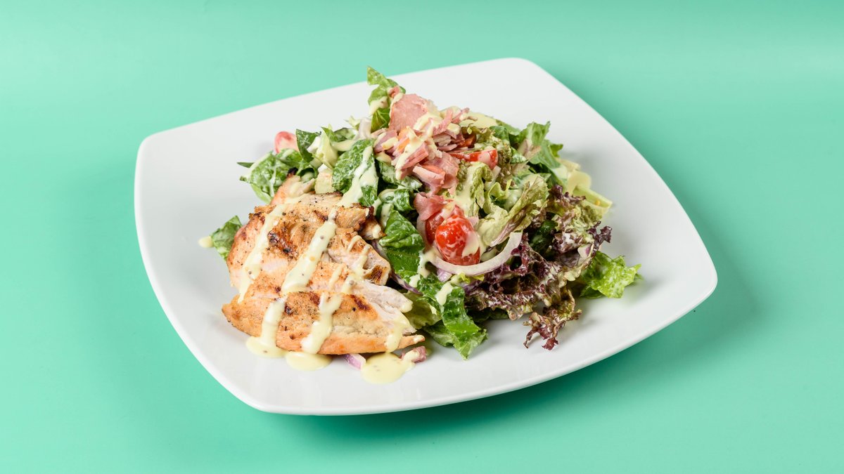 Σαλάτα με φιλέτο κοτόπουλο, φρεσκοκομμένο τραγανό μαρούλι, κόκκινη λόλα, τοματίνια, κόκκινο κρεμμύδι, αβοκάντο, τραγανό μπέικον και honey mustard sauce