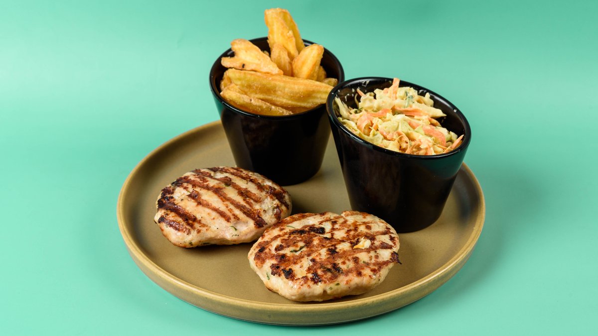 Συνοδεύεται από πατάτες τηγανητές και σαλάτα coleslaw