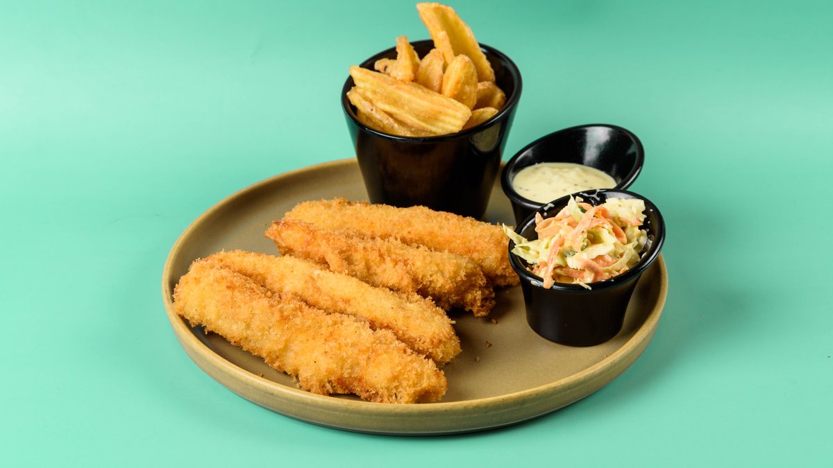 Παναρισµένα φιλέτα κοτόπουλο µε honey musturd sauce και coleslaw. Συνοδεύονται από τηγανητές πατάτες