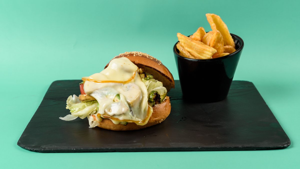Με μπιφτέκι από μοσχαρίσιο κιμά, cheddar, καραμελωμένο κρεμμύδι, πάστα μανιταριών, μπέικον, ντομάτα, iceberg και μαγιονέζα μαύρης τρούφας. Συνοδεύεται από γαρνιτούρα της επιλογής σας