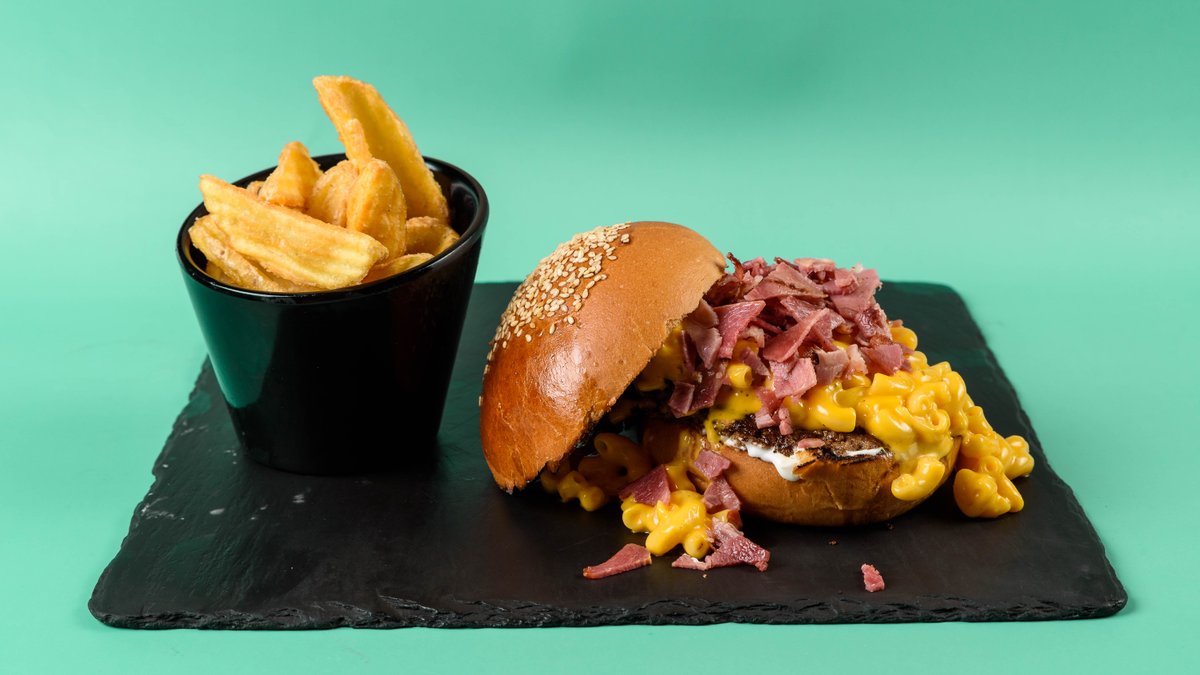 Με διπλό Smashed μπιφτέκι, cheddar, ψιλοκομμένο bacon, Mac&Cheese, μαγιονέζα