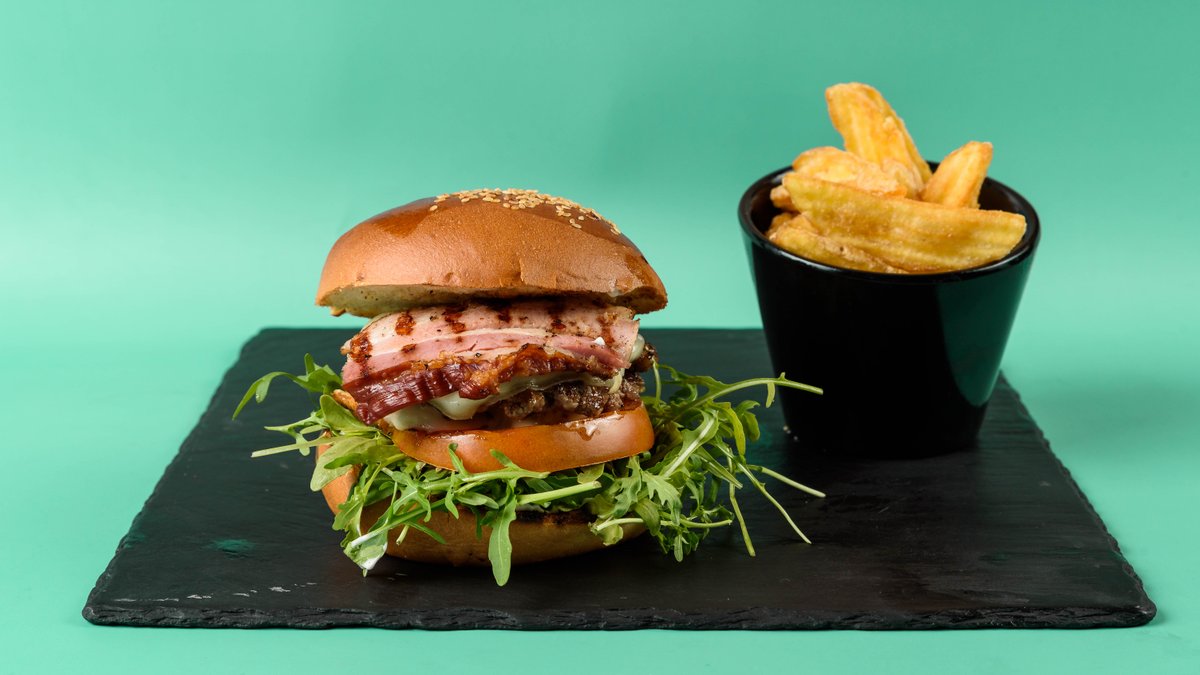 Με μπιφτέκι από μοσχαρίσιο κιμά, µπισκότο παρµεζάνας , µαρµελάδα μπέικον, καραµελωµένα κρεµµύδια, μπέικον, ντοµάτα, iceberg και µαγιονέζα µαύρης τρούφας. Συνοδεύεται από γαρνιτούρα της επιλογής σας