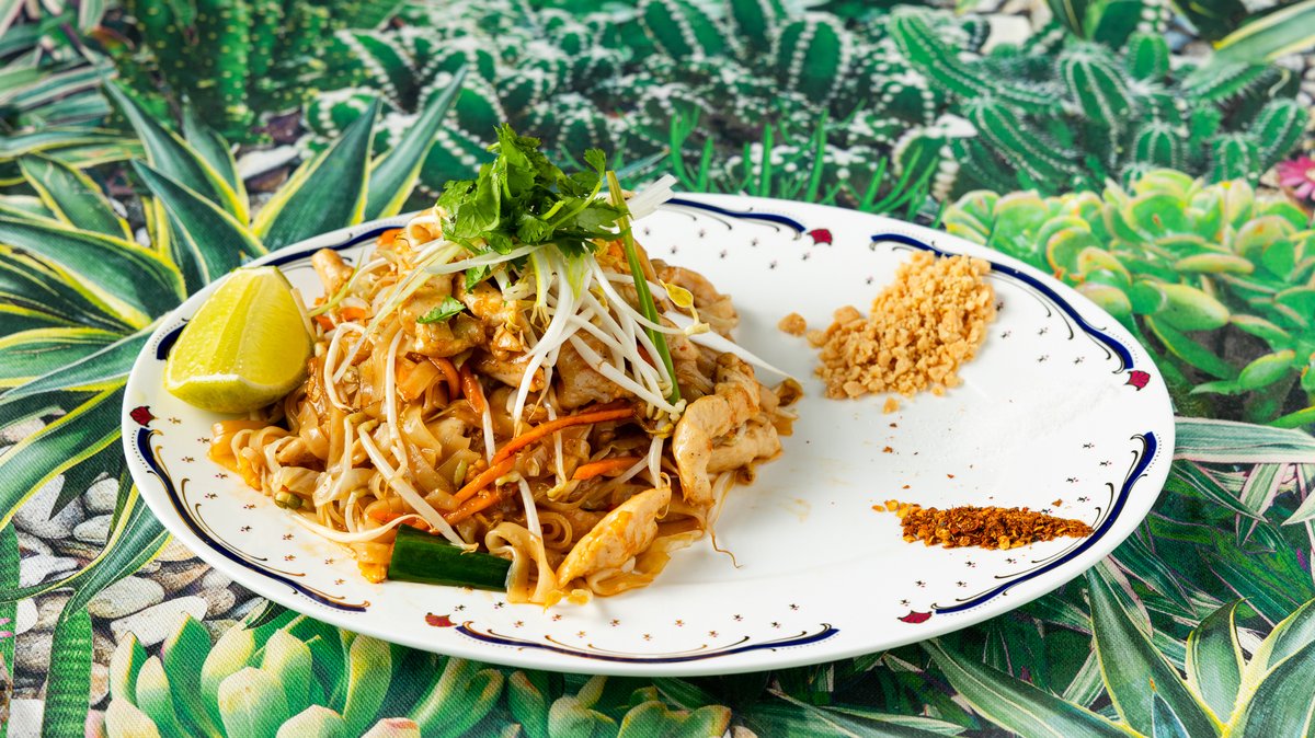 Κλασική, ταϊλανδέζικη συνταγή στο wok με noodles ρυζιού, κοτόπουλο, αυγό, φρέσκα λαχανικά και tamarind sauce