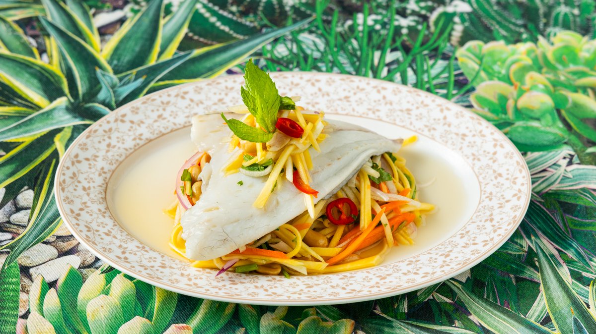 Τσιπούρα ατμού, τζίντζερ, μάνγκο, πράσινο μήλο, σάλτσα ψαριού