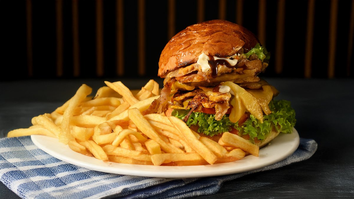 Διπλό Μπιφτέκι, ομελέτα, Διπλό Cheddar, Διπλό μπέικον, καραμελωμένα κρεμμύδια, ντομάτα, μαρούλι, bbq sauce, κέτσαπ, μουστάρδα, μαγιονέζα. Συνοδεύεται από πατάτες τηγανητές.