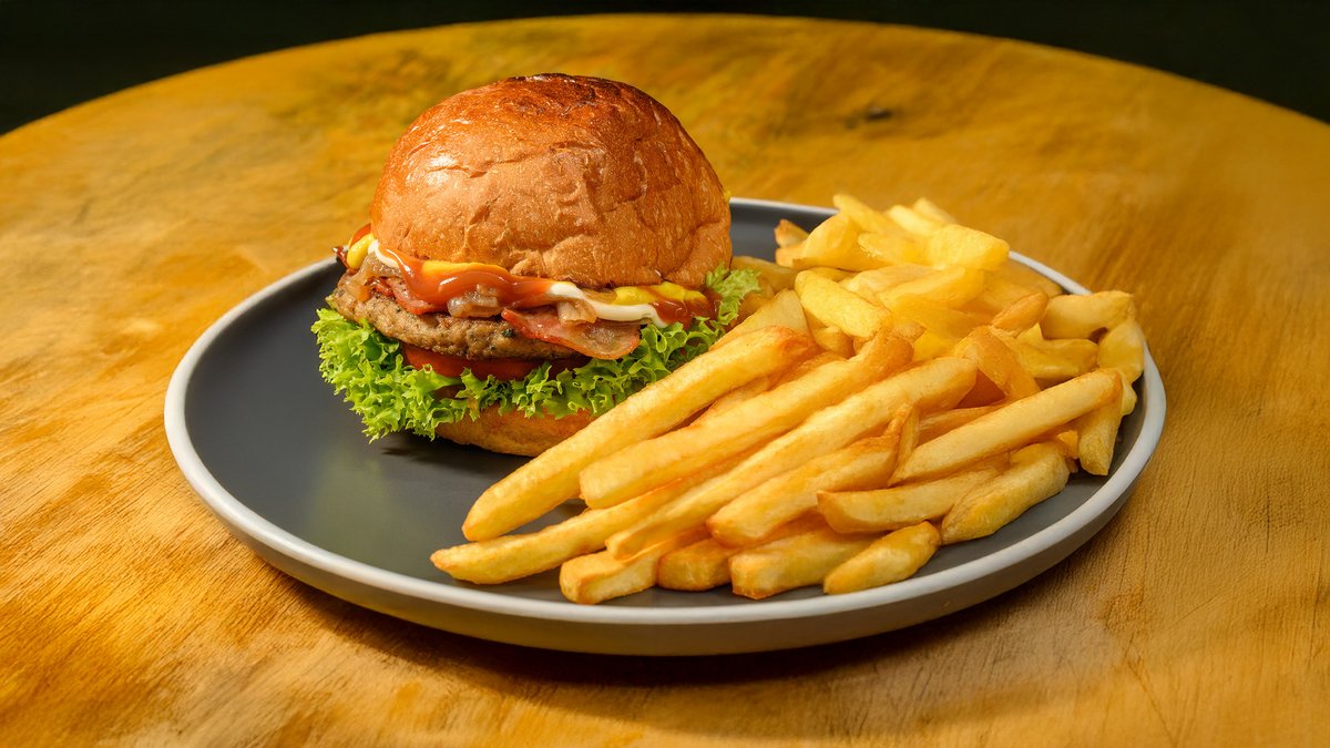 Μπιφτέκι , κοπανιστη, μπεϊκον, cheddar, ντομάτα, μαρούλι, καραμελωμενα κρεμμυδια, bbq sauce κέτσαπ, μουστάρδα. Συνοδεύεται από πατάτες τηγανητές.