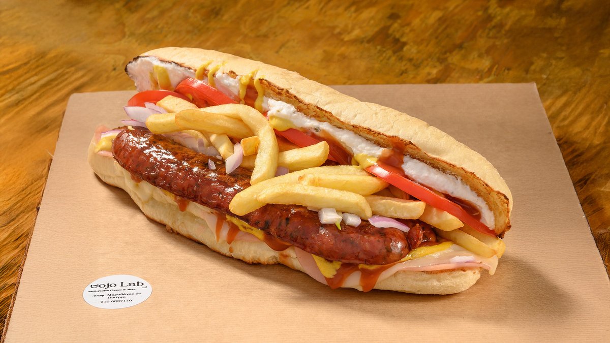 Με τυρί, ζαμπόν, λουκανικο χωριάτικο, τυροσαλάτα, κέτσαπ, μουστάρδα, ντομάτα, κρεμμύδι και πατάτες