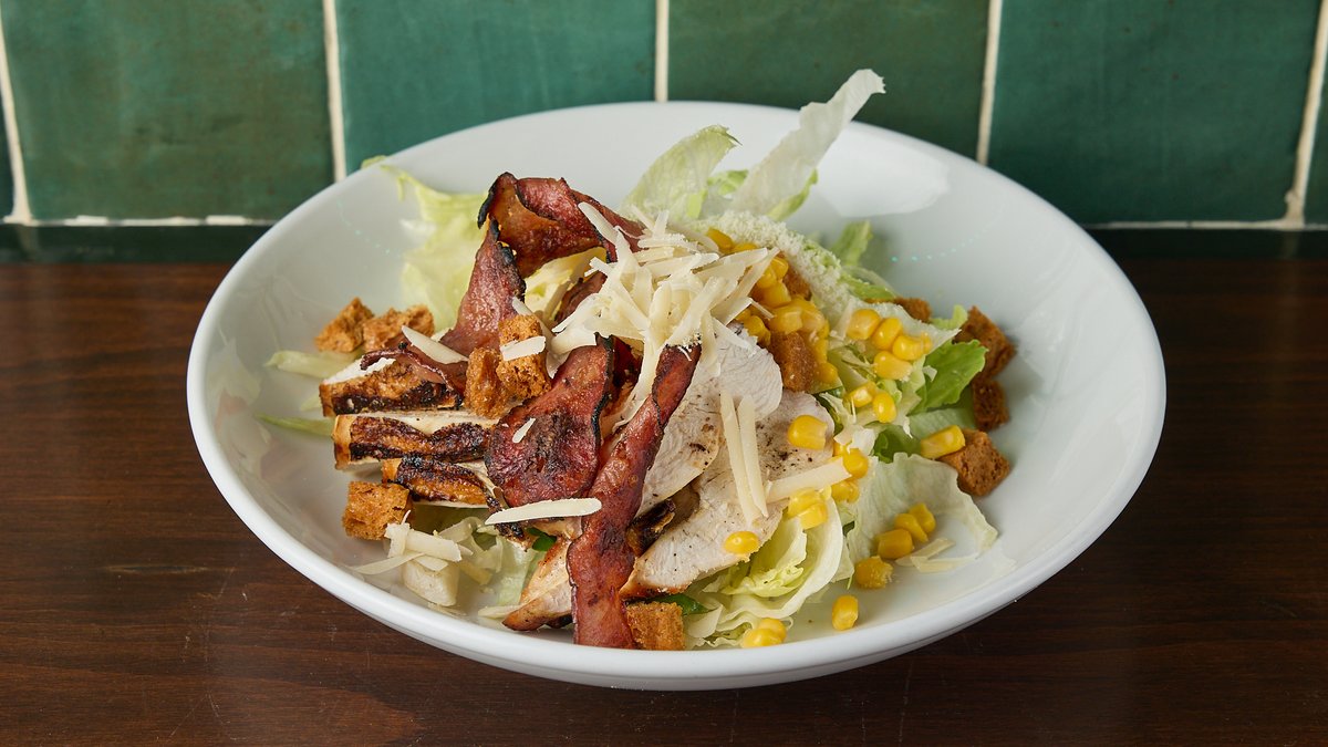 Με φιλέτο κοτόπουλο, μαρούλι, αϊσμπεργκ, καλαμπόκι, μπέικον, παρμεζάνα φλέικς και αυθεντική σάλτσα σίζαρς