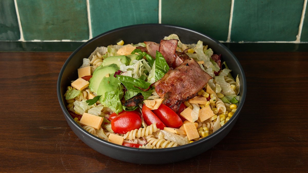 Φουσίλι, ντοματίνια, αϊσμπεργκ, αβοκάντο, καλαμπόκι, μπέικον, τυρί cheddar και σως 1000 islands