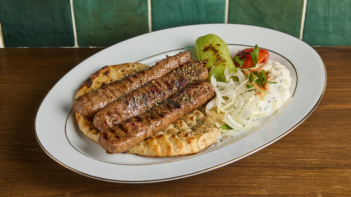 Με ντομάτα, κρεμμύδι, πατάτες τηγανητές, dip τζατζίκι και πίτα