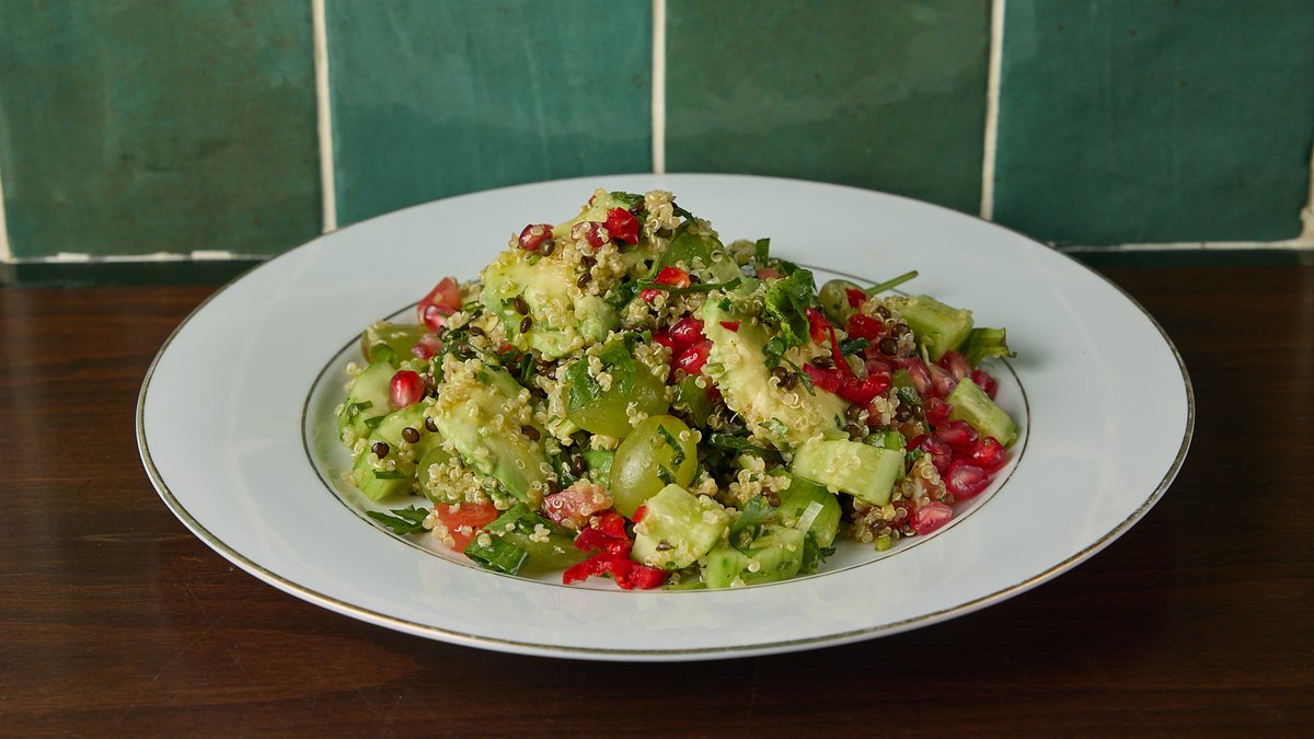 Ντομάτα, αγγούρι, αβοκάντο, τζίντζερ, λάιμ, σταφύλι, ρόδι, δυόσμος και τσίλι