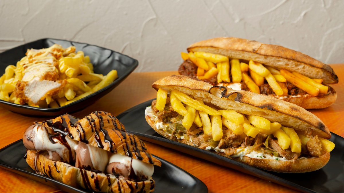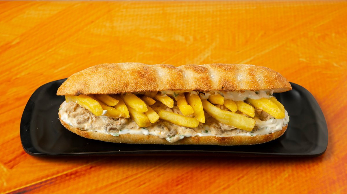 Πανίνι με χοιρινή τηγανιά, πατάτες, sauce σχινόπορασο