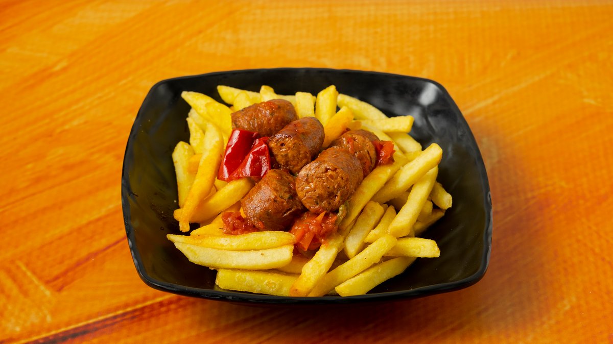 Πατάτες τηγανητές με κοκκινιστό λουκάνικο μαγειρεμένο με πράσινες και κόκκινες πιπεριές