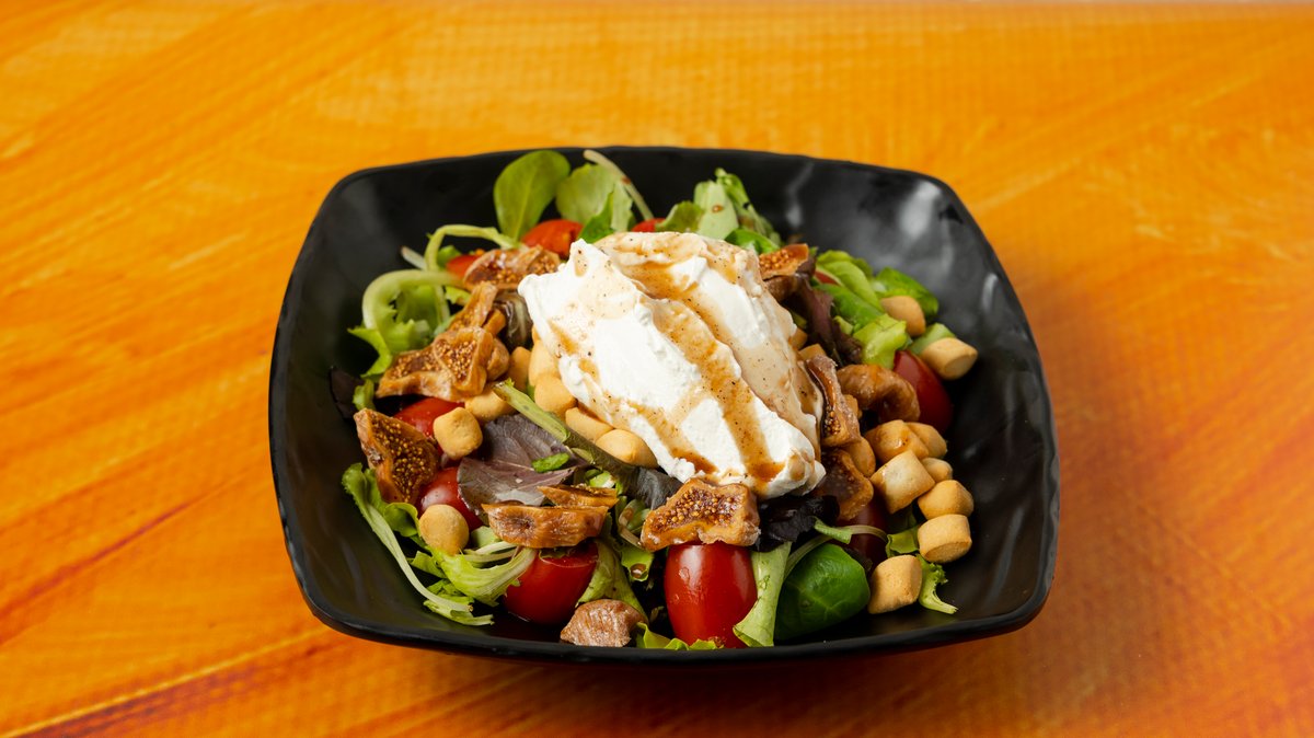 Σαλάτα mix με sauce βαλσαμικόυ, ντοματίνια, τσαλαφούτι, κρουτόν, σύκο