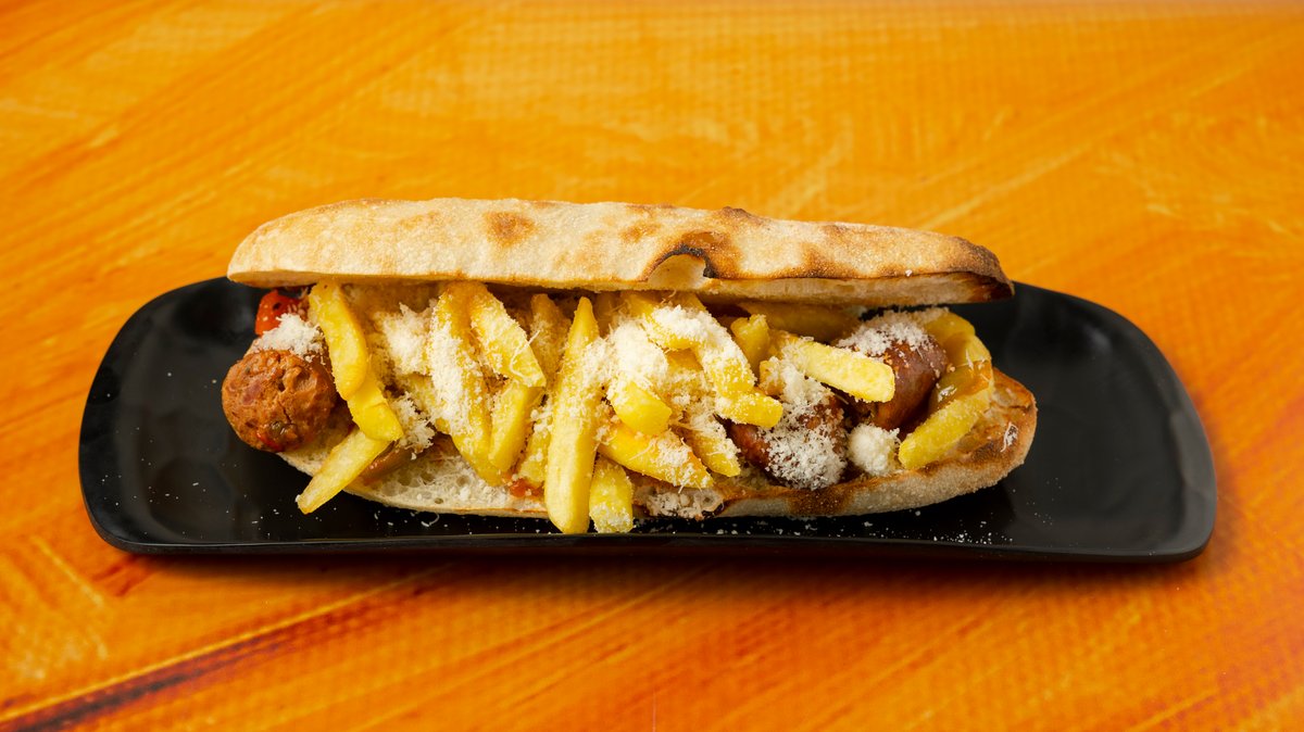 Πανίνι με κοκκινιστό λουκάνικο μαγειρεμένο με πράσινες και κόκκινες πιπεριές, πατάτες, γραβιέρα τριμμένη