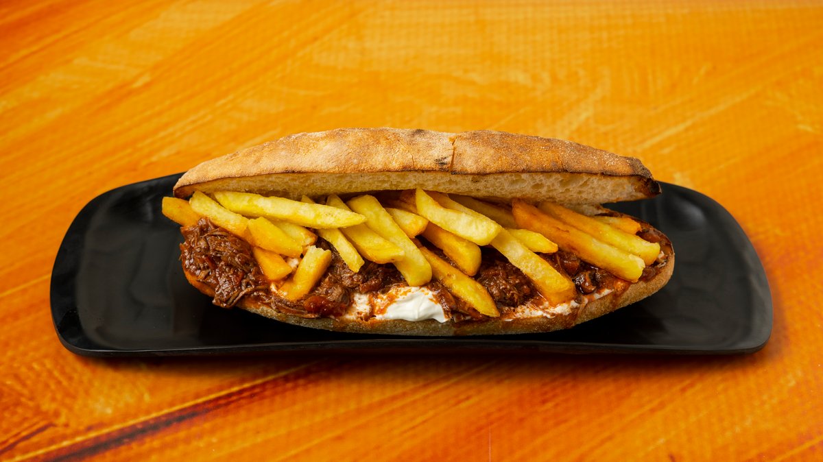 Πανίνι με κοκκινιστό μοσχάρι, πατάτες, sauce φέτας
