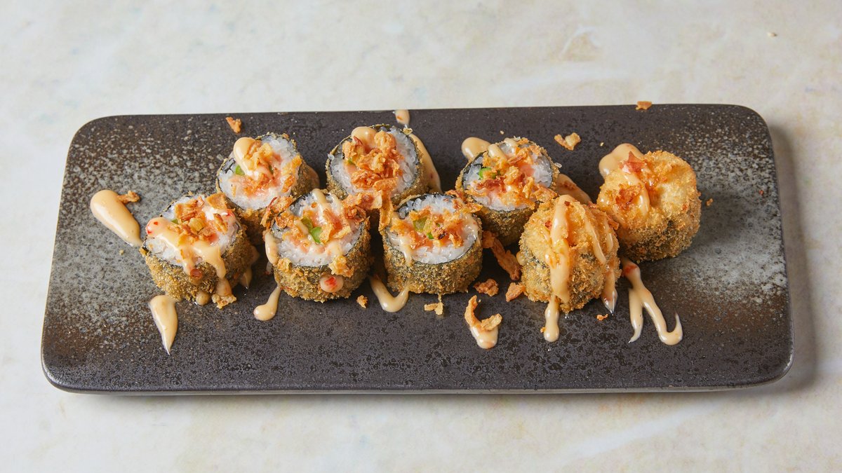 Με τηγανητό καβούρι, πικάντικη μαγιονέζα, orange και wasabi tobiko, wasabi sauce, αγγούρι, tempura flakes και teriyaki sauce
