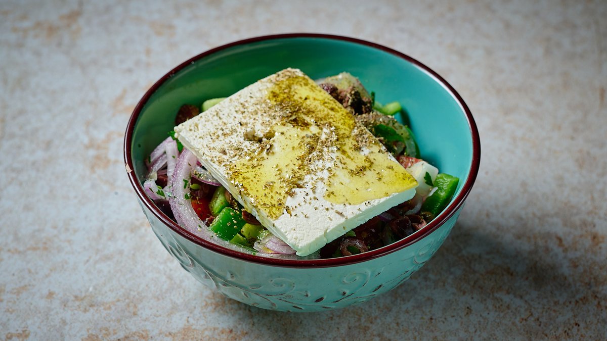 Με ντομάτα, αγγούρι, κρεμμύδι, ελιές, φέτα και pesto ρίγανης με ηλιόσπορο