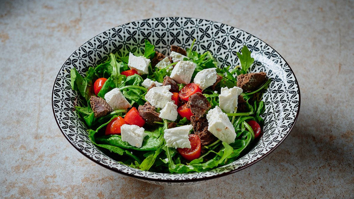 Σαλάτα με σπανάκι, ρόκα, παξιμάδια χαρουπιού, ντοματίνια, ανθότυρο, και κρέμα βαλσάμικο εσπεριδοειδών