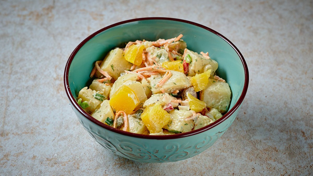 Σαλάτα με πατάτες, πορτοκάλι, φρέσκο κρεμμύδι, άνηθο, ελιές, κάππαρη, καρότο, πιπεριά Φλωρίνης και χειροποίητη honey mustard mayo