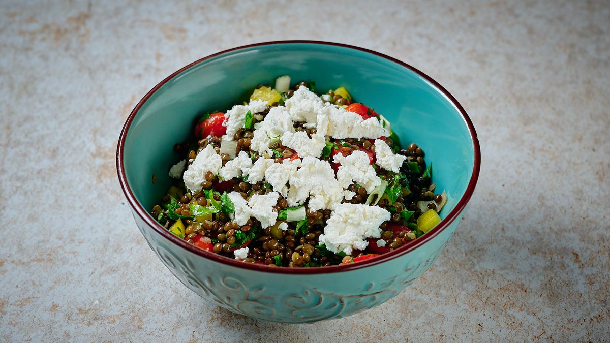 Σαλάτα με μαύρες φακές, γαλομυζήθρα, ντοματίνια, μαϊντανό, κύμινο, φρέσκο κρεμμύδι, κίτρινη πιπεριά, βαλσάμικο και ελαιόλαδο