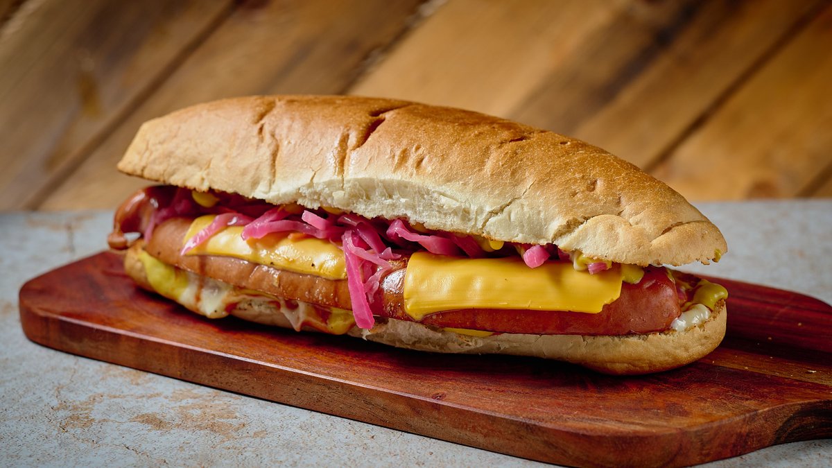Με λουκάνικο, cheddar, πίκλα (λάχανο, καρότο, κρεμμύδι), μουστάρδα και ketchup