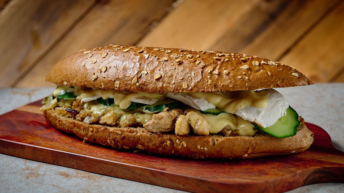 Με μαγειρεμένο κοτόπουλο (με κρεμμύδι, κάππαρη, μουστάρδα, κρασί και δεντρολίβανο), αγγούρι, ανθότυρο και χειροποίητη honey mustard mayo