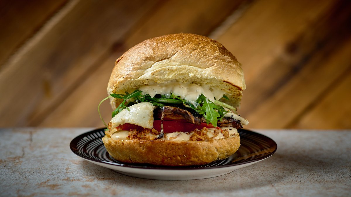 Με ψητό μανιτάρι Portobello, τυρί σχάρας, ρόκα, ντομάτα, τραγανό κρεμμύδι και χειροποίητη mayo με καραμελωμένα πράσσα