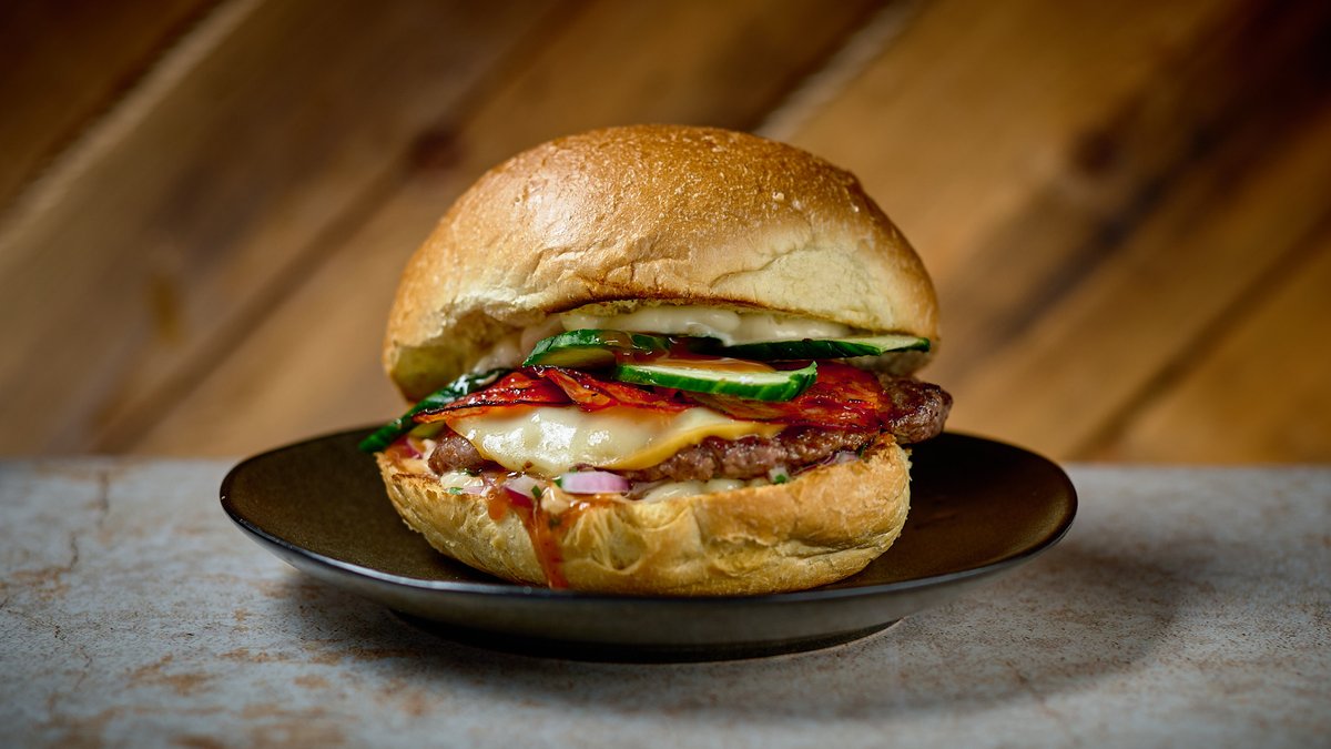 με μπιφτέκι μοσχαρίσιο 175g, cheddar, τραγανό κρεμμύδι, πίκλα αγγουριού, sauce μουστάρδας με καραμελωμένα κρεμμύδια και μπίρα guinness