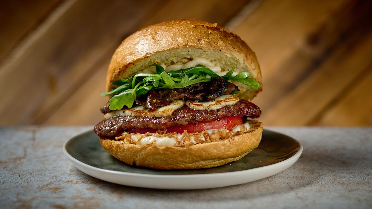 Με μπιφτέκι μοσχαρίσιο 175g, τυρί σχάρας, μανιτάρια σωτέ, τραγανό κρεμμύδι, ντομάτα, ρόκα και χειροποίητη mayo με τρούφα