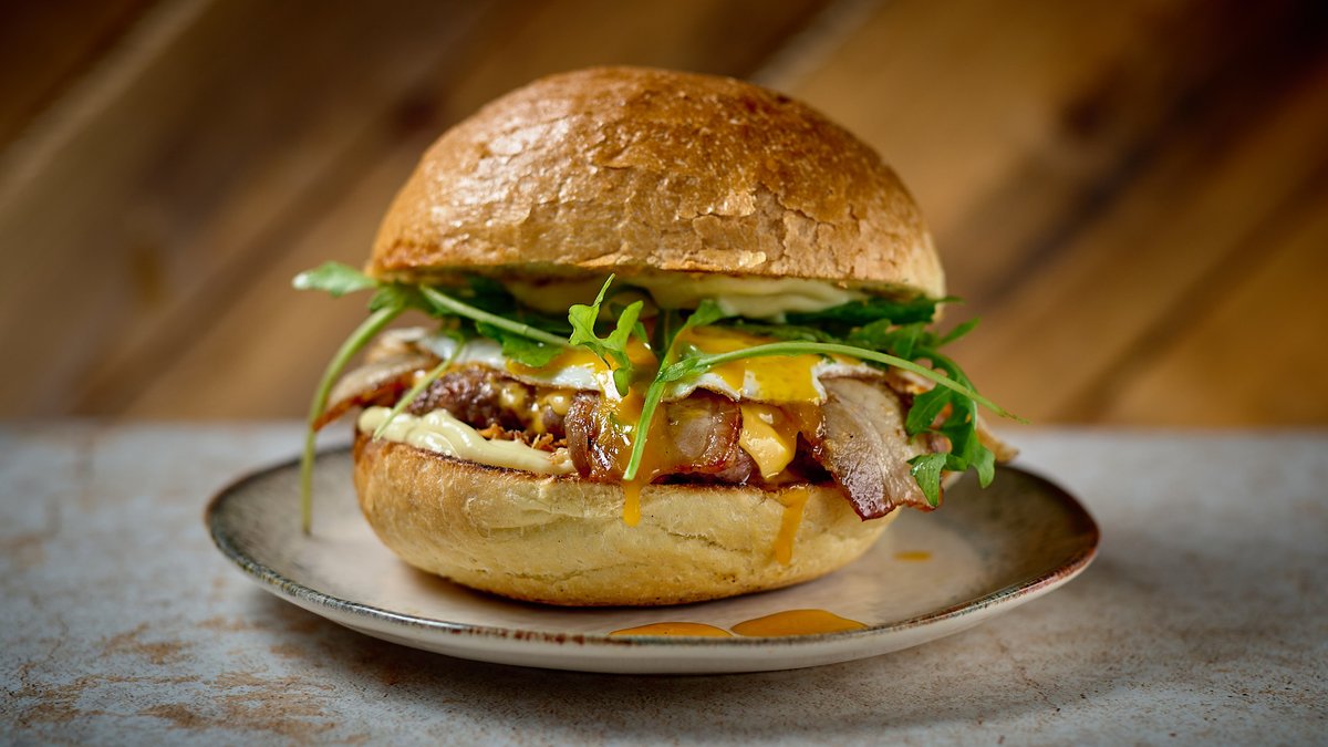 Με μπιφτέκι μοσχαρίσιο 175g, χειροποίητο μπέικον, cheddar, αυγό μάτι, τραγανό κρεμμύδι, ρόκα και χειροποίητη honey mustard mayo