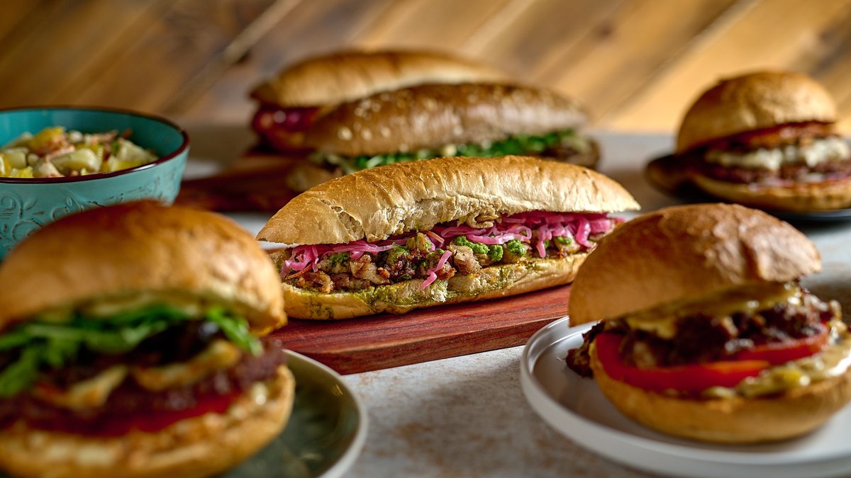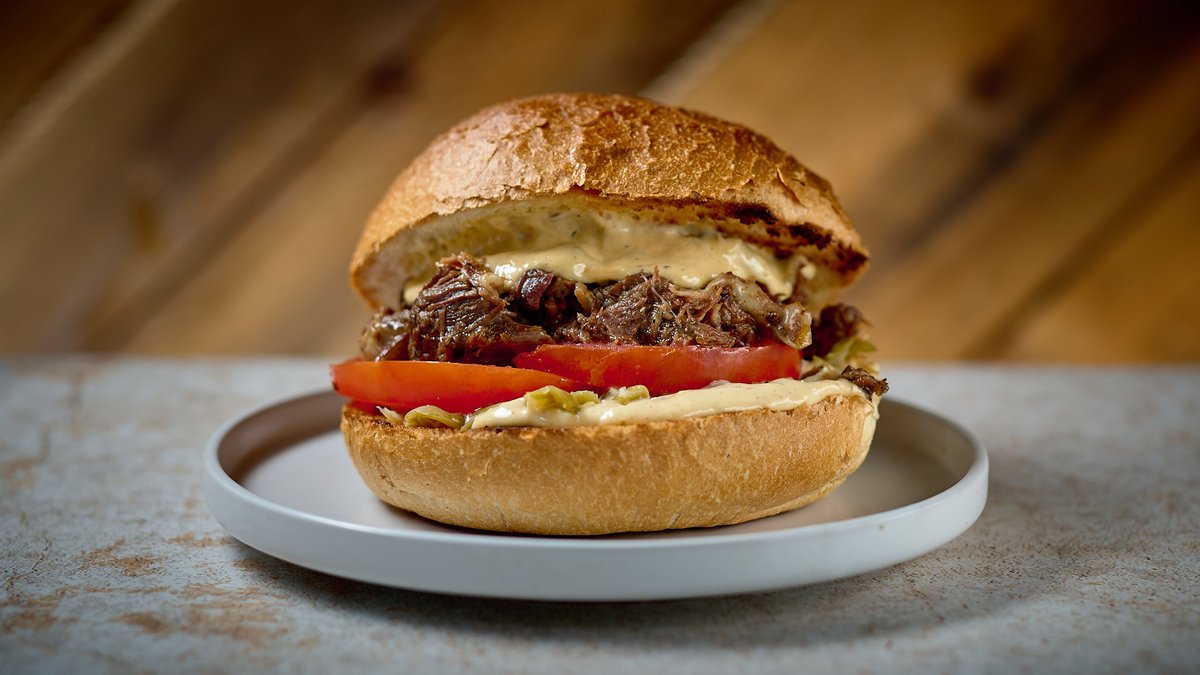Με πρόβατο μαγειρεμένο σε μπύρα, καπνιστό τυρί, φασολάκι πίκλα, ντομάτα και χειροποίητη mayo με καραμελωμένα πράσσα