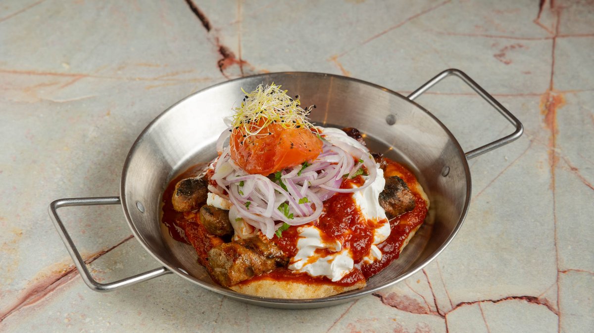 Με σάλτσα γιαουρτιού, κρεμμύδι, μαϊντανός, σάλτσα ντομάτας και πίτα