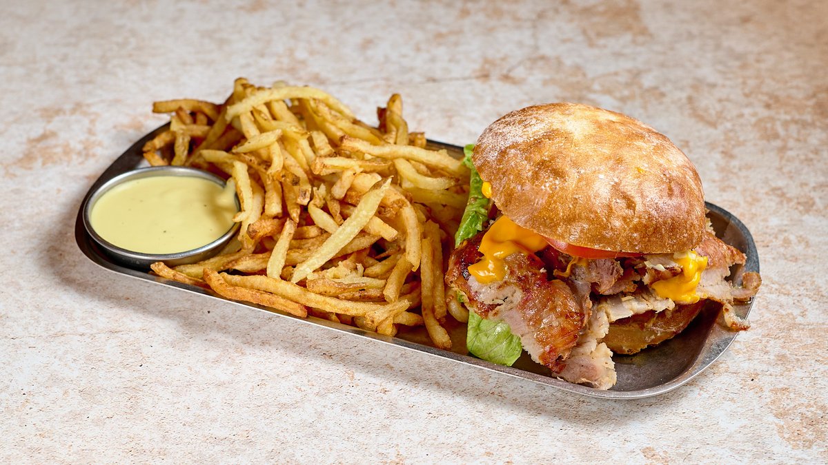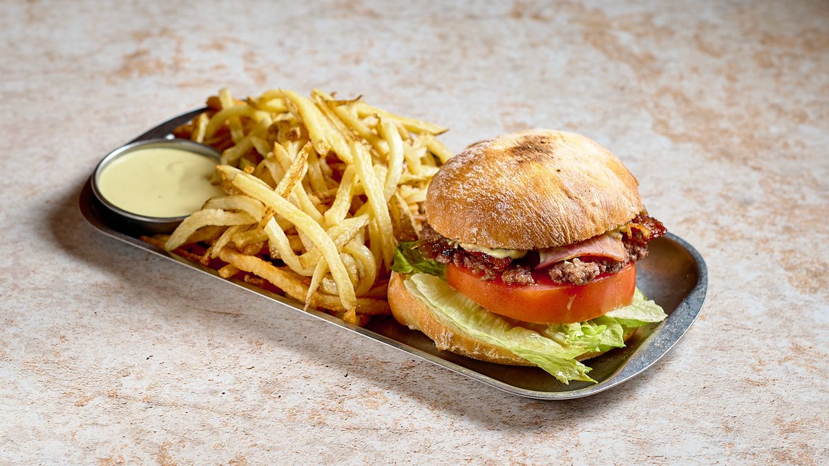 Με ντομάτα, άϊσμπεργκ, τσένταρ, μπέικον, καραμελωμένο κρεμμύδι, πατάτες και σως suvla